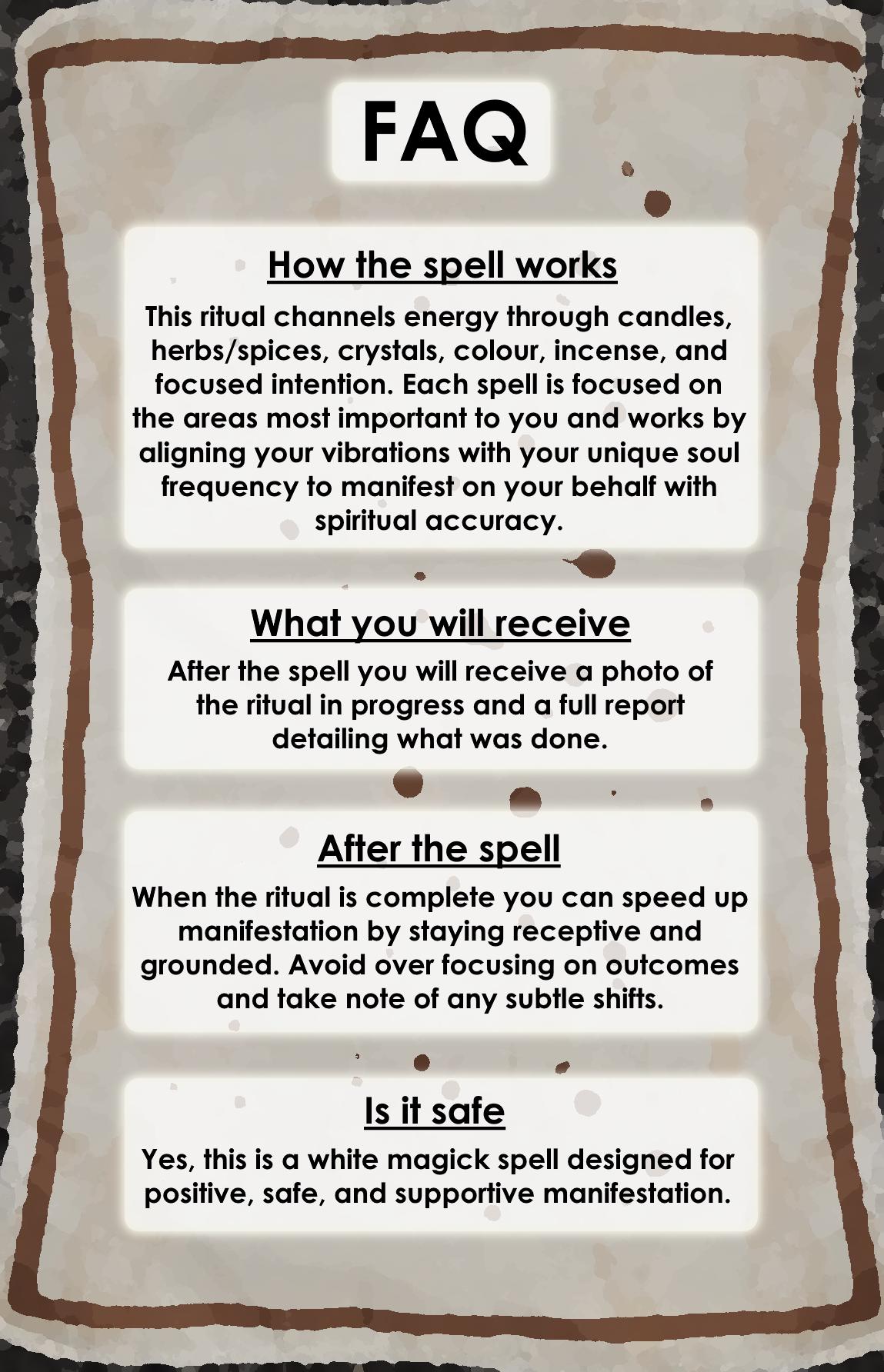 ă…… Each spell is focused on the areas most important to you and works by aligning your vibrations with your unique soul frequency to manifest on your behalf with spiritual accuracy.